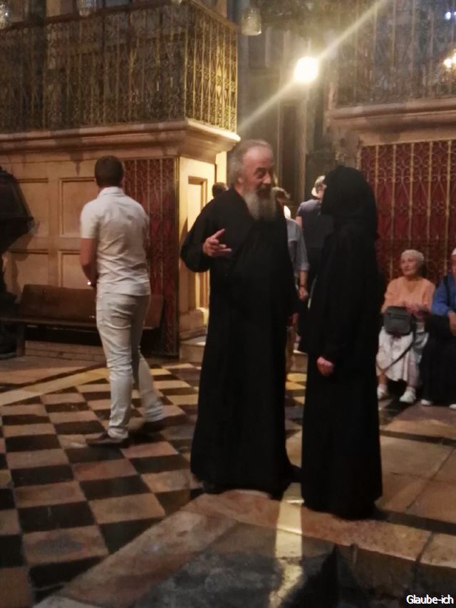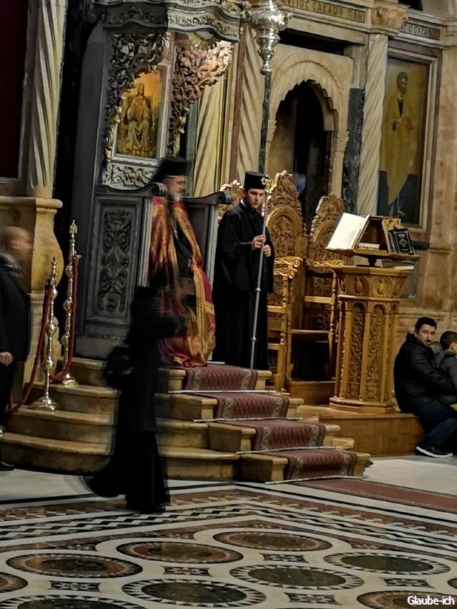 Die griechisch orthodoxe Kirche feiert ihre Heilige Messe gegenüber dem heiligen Grab. Sie sind auch zuständig für den Ablauf der großen Pilgergruppen. Lassen Sie sich verzaubern und besuchen auch mal eine Heilige Messe innerhalb der Grabeskirche.