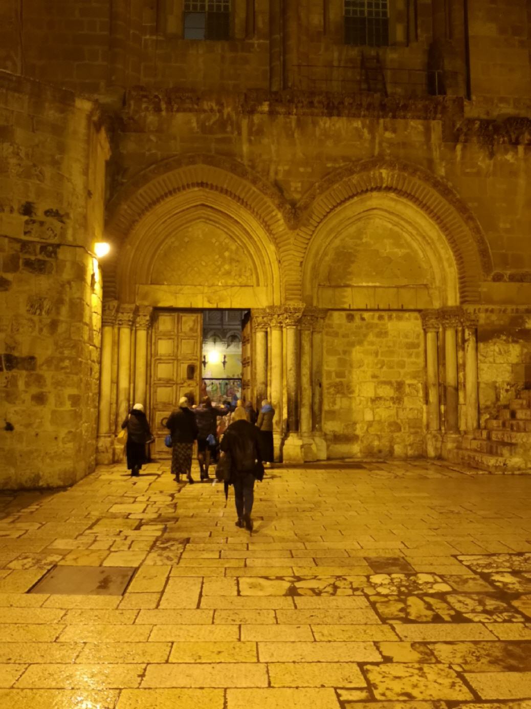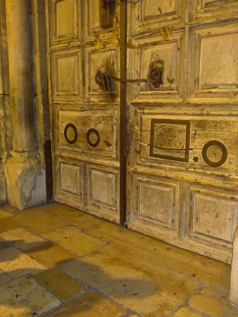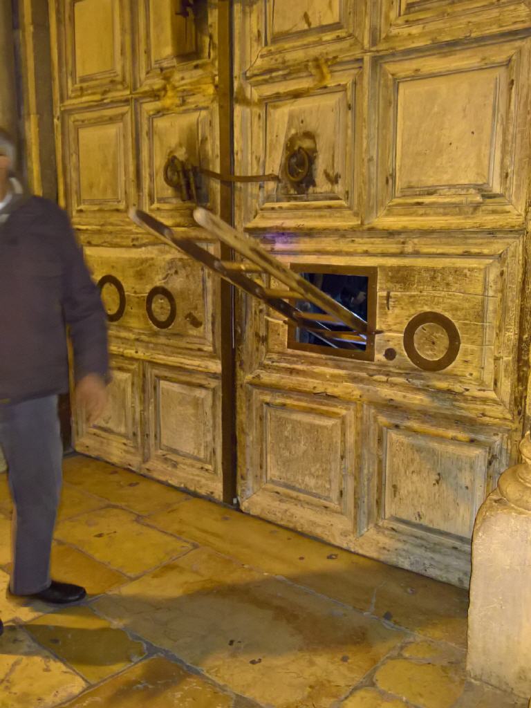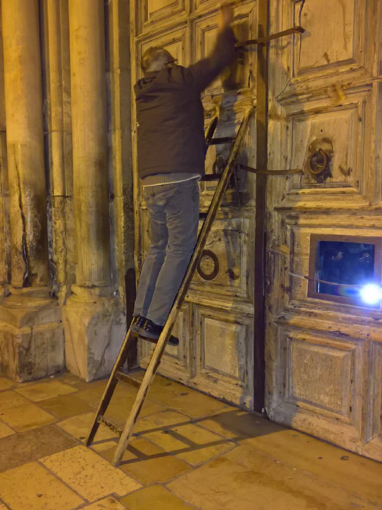 Seit Salhadin die Kreuzfahrer aus Jerusalem vertrieben hat, liegt das Besitzrecht der einzigen Eingangstür in die Grabeskirche bei zwei muslimischen Familien. Ein Angestellter der Familien öffnet und schließt täglich zu den festgesetzten Zeiten von außen das Tor. Um zum Schloss zu gelangen, muss er eine Leiter besteigen. Die Leiter wird nach dem Abschließen durch ein Türchen in der Tür in die Grabeskirche gegeben und im Innern aufbewahrt