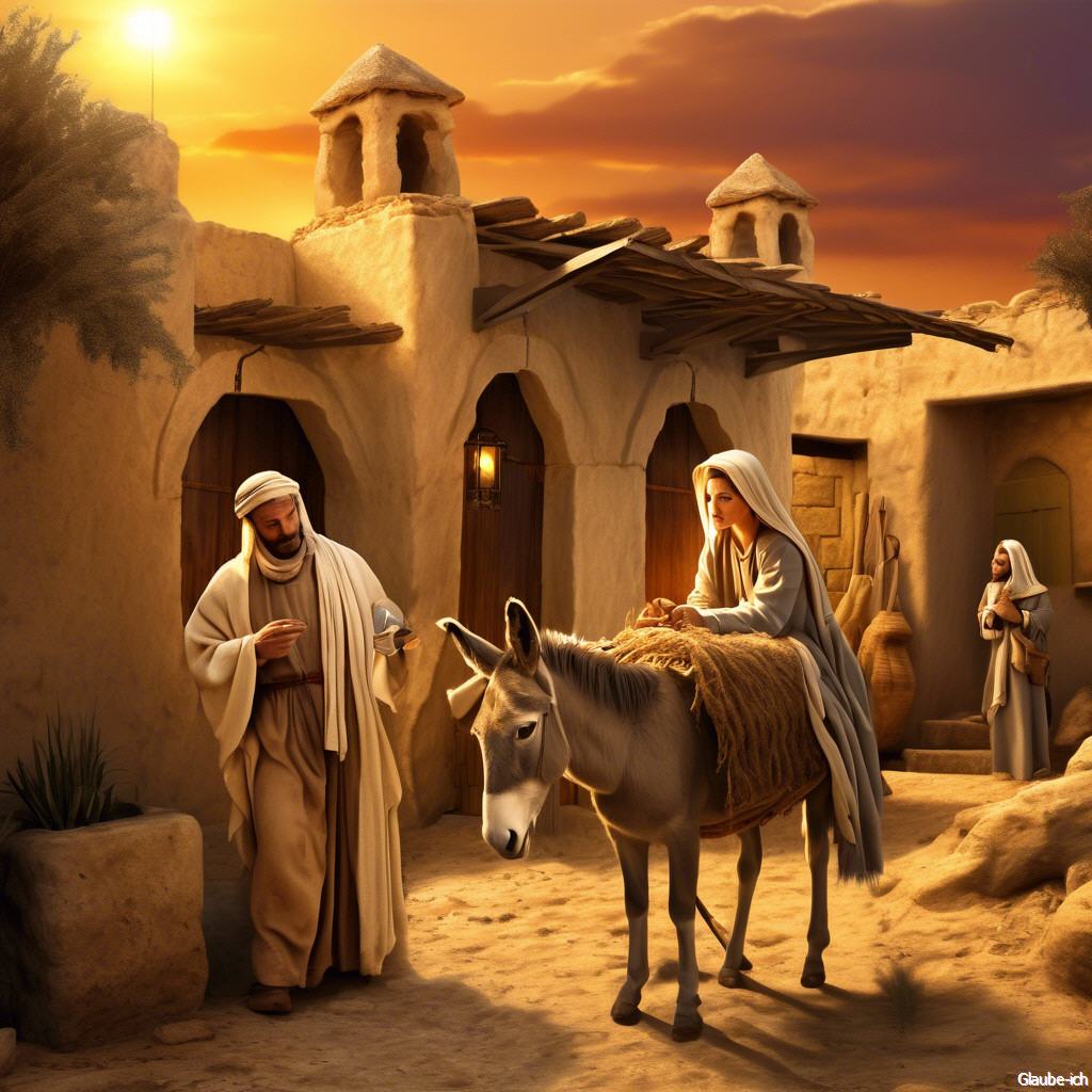 Als die Zeit erfüllt war, machten sich Maria und Josef auf den Weg nach Betlehem, um sich dort beim Zensus einschreiben zu lassen. Doch als sie in der Stadt ankamen, fanden sie keine Unterkunft. Überall waren die Herbergen überfüllt, denn viele waren gekommen, um sich registrieren zu lassen.